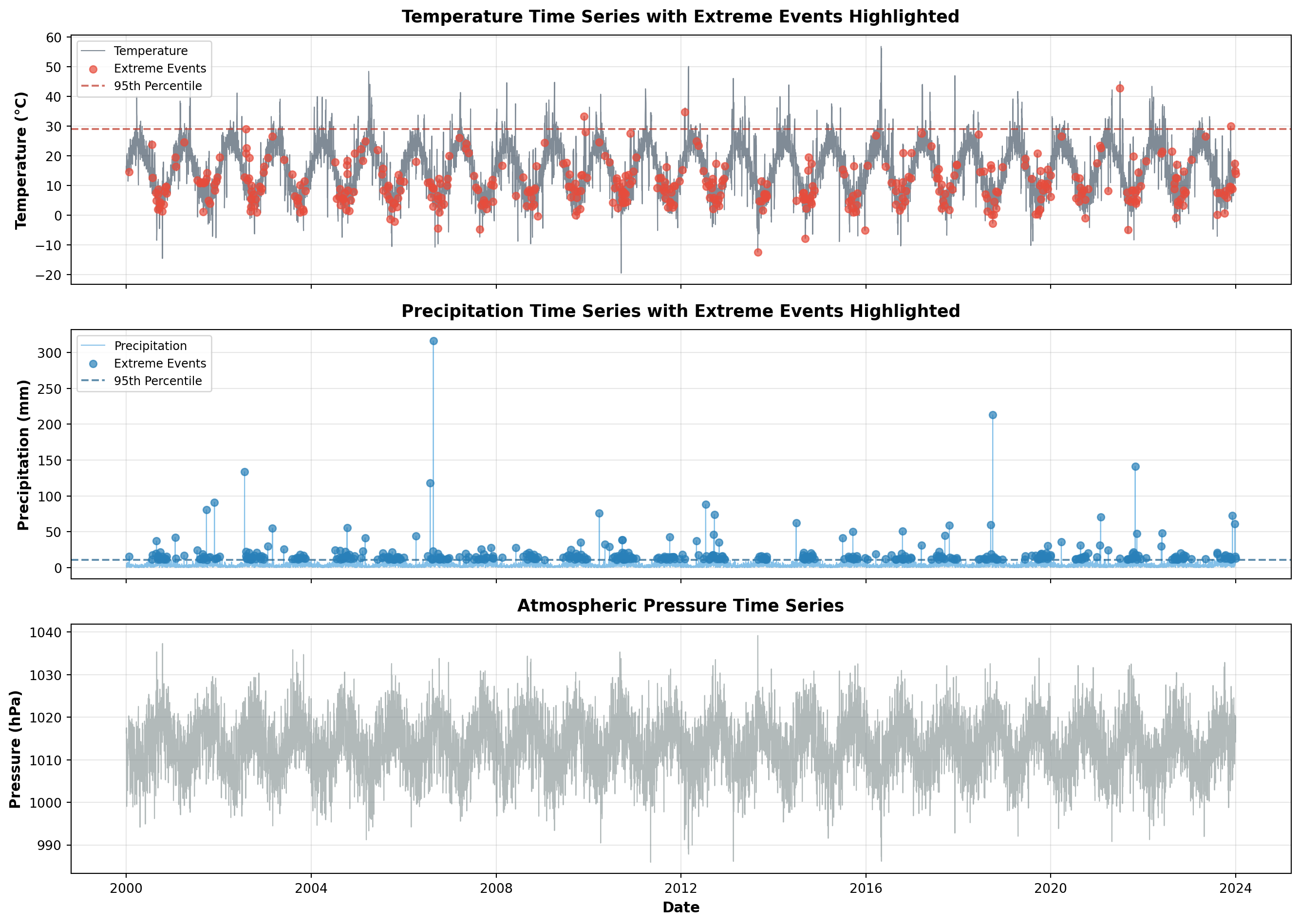Before we can identify extremes, we need a baseline. Synthetic data generation here serves two purposes: it provides a controlled environment to test methods, and it demonstrates how realistic climate variability can emerge from relatively simple stochastic processes. The data spans 24 years (2000-2023) with daily resolution, capturing temperature, precipitation, and atmospheric pressure—three variables that interact in complex ways.
