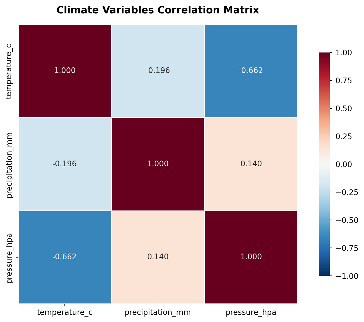 print(f" Precipitation-Pressure: {corr_matrix.loc['precipitation_mm', 'pressure_hpa']:.3f}")